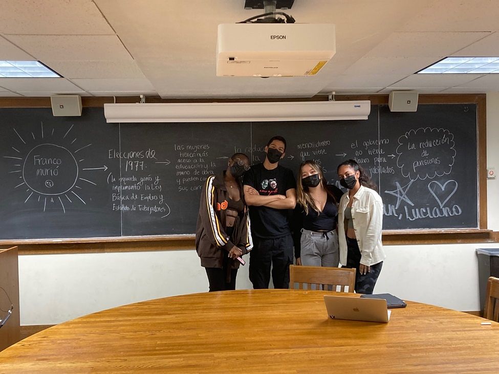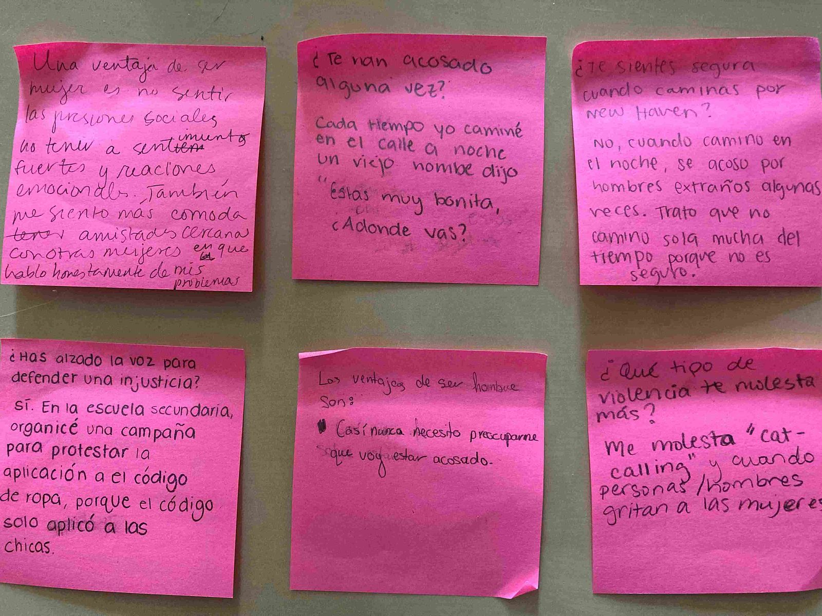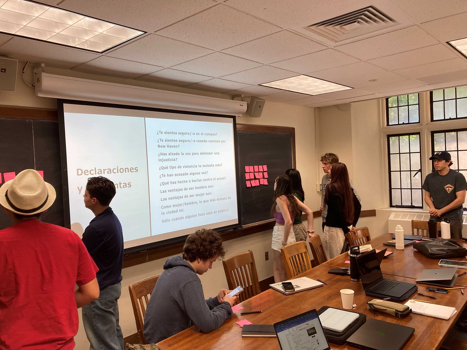 In my classes, I like to incorporate hands-on activities. For example, in SPAN 140, we recreated an art installation by Monica Mayer within the four walls of the classroom. Using pink sticky notes, students wrote their reactions to prompts related to violence against women and placed them on the blackboard, which was our improvised "clothesline" (see picture below).